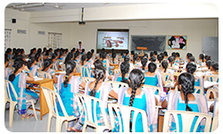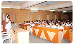 The auditorium is furnished with modern seating arrangements which can accommodate 650 people. It has got a good platform, inbuilt LCD facilities with Good AV aid and other necessary facilities. The monthly ongoing student welfare programs, celebration of festivals and other extracurricular activities are conducted in the auditorium. Various seminars, Workshops, Conferences related to the branches of Nursing Curriculum have been organized in the auditorium.